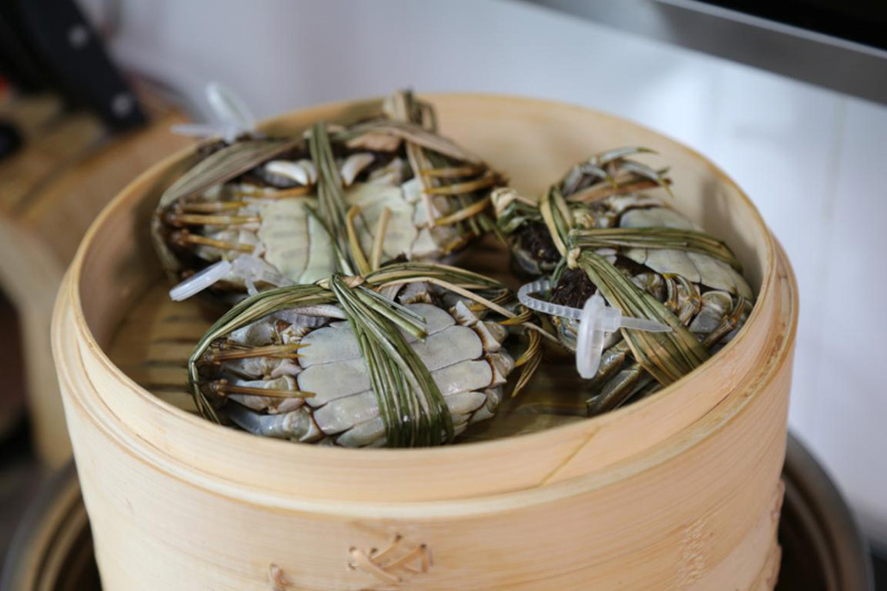 把大闸蟹放在蒸锅里的方式也有讲究,要把大闸蟹的背部朝下、肚子朝上,用这样的摆放方式,一来可以让大闸蟹受热更均匀,二来可以避免美味的蟹黄从蟹壳里漏出来。