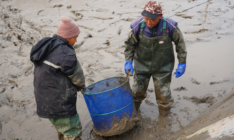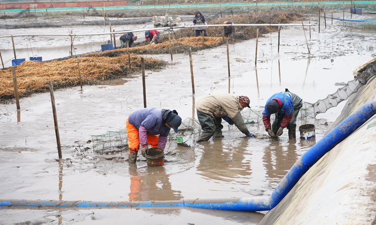 由于今年天气寒冷,扣蟹没有进入提前放置好的地笼中,需将扣蟹专用养殖蟹塘里的水抽干后,蟹农踩着齐膝深的淤泥,火眼金睛地将调皮的蟹宝宝从水草里挑拣出来,集中装入笼网内。